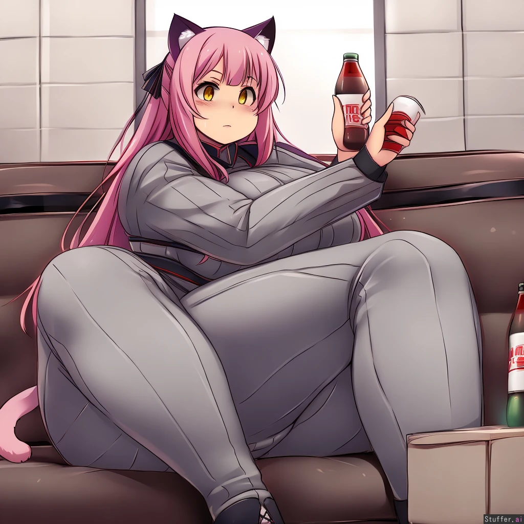 best quality, high rating, betterwithsalt (artist), kurocaze-s (artist), miramiraclerun (artist), KipTeiTei (artist), Orristerioso (artist), c.cu (artist), pixiveo (artist), 1 girl, solo, long straight hair, pink hair, yellow eyes, cat ears, cat tail, gray bodysuit, living room, sitting on couch, expressionless, drinking bottle of coke,