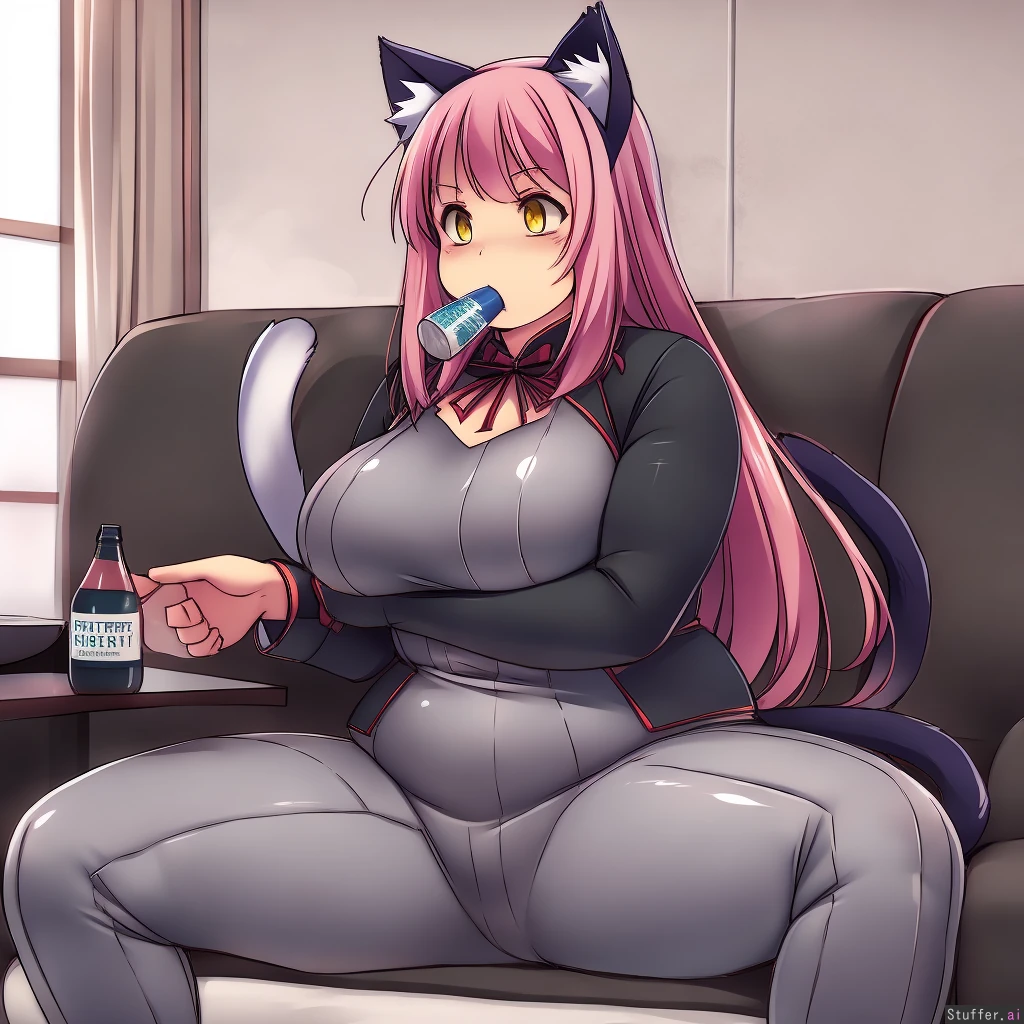 best quality, high rating, betterwithsalt (artist), kurocaze-s (artist), miramiraclerun (artist), KipTeiTei (artist), Orristerioso (artist), c.cu (artist), pixiveo (artist), 1 girl, solo, long straight hair, pink hair, yellow eyes, cat ears, cat tail, gray tight suit, living room, sitting on couch, expressionless, drinking bottle of coke, bottle in mouth,