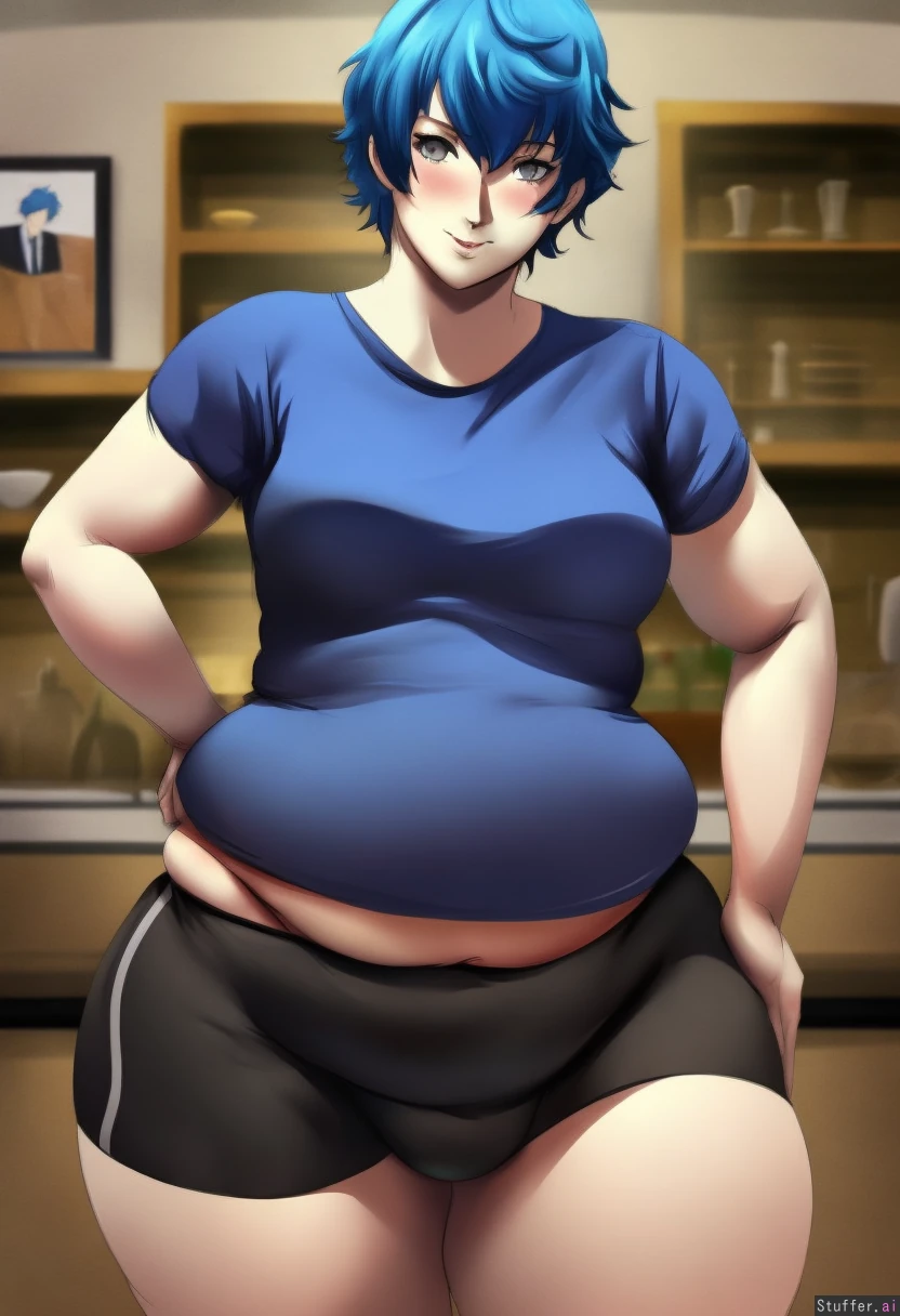 best quality, high rating, High quality, high rating, uhd, masterpiece, detailed face, 1girl, belt-buster(artist), zeroqrisu(artist), (Naoto Shirogane, persona 4, blue hair, grey eyes), Japanese inn kitchen background, (small blue T-shirt, wearing a binder, black sport shorts), view from front, looking at viewer, blushing, (visible belly:1), (flirting, presenting, teasing) (Shiny skin, simple shading), simple nose, simple anime eyes, mature, (defined lineart), tall, standing, Chubby, Fatter lower belly, love handles, chunky fat square hips, (big boobs:0.1), saddlebag hips, chunky fat ass, wide ass, (square shaped ass cheeks, shelf ass, fupa,