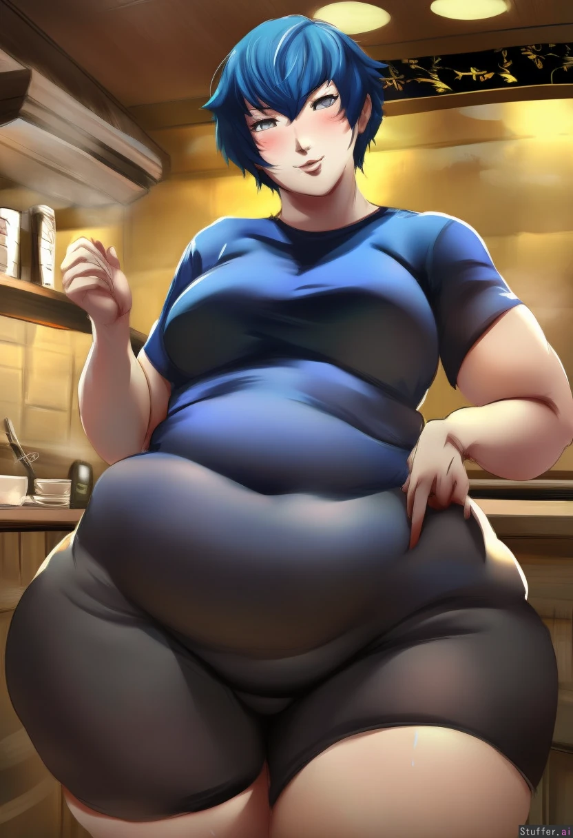 best quality, high rating, High quality, high rating, uhd, masterpiece, detailed face, 1girl, belt-buster(artist), zeroqrisu(artist), (Naoto Shirogane, (persona 4), blue hair, grey eyes), Japanese inn kitchen background, (small blue T-shirt, wearing a binder, black sport shorts), view from front, looking at viewer, blushing, (visible belly:1), (flirting, presenting, teasing) (Shiny skin, simple shading), simple nose, simple anime eyes, mature, (defined lineart), tall, standing, Chubby, Fatter lower belly, love handles, chunky fat square hips, (big boobs:0.1), saddlebag hips, chunky fat ass, wide ass, (square shaped ass cheeks, shelf ass, fupa,