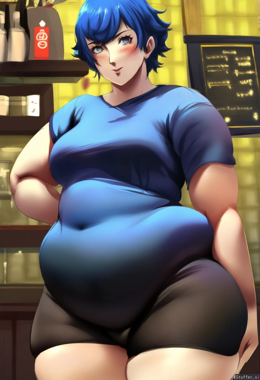 best quality, high rating, High quality, high rating, uhd, masterpiece, detailed face, 1girl, belt-buster(artist), zeroqrisu(artist), (Naoto Shirogane, (persona 4), blue hair, grey eyes), Japanese inn kitchen background, (small blue T-shirt, wearing a binder, black sport shorts), view from front, looking at viewer, blushing, (visible belly:1), (flirting, presenting, teasing) (Shiny skin, simple shading), simple nose, simple anime eyes, mature, (defined lineart), tall, standing, Chubby, Fatter lower belly, love handles, chunky fat square hips, (big boobs:0.1), saddlebag hips, chunky fat ass, wide ass, (square shaped ass cheeks, shelf ass, fupa,