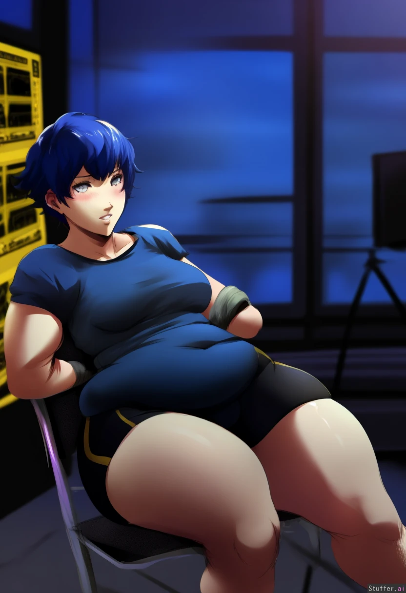 best quality, high rating, High quality, high rating, uhd, masterpiece, detailed face, 1girl, belt-buster(artist), zeroqrisu(artist), (Naoto Shirogane, (persona 4), blue hair, grey eyes), dimly lit room with multiple screens on the walls background, (small blue T-shirt, wearing a binder, black sport shorts), view from front, blushing, (visible belly:1), (struggling), Shiny skin, simple shading), simple nose, simple anime eyes, mature, (defined lineart), tall, sitting, sitting in a chair, restrained, Chubby, Fatter lower belly, love handles, chunky fat square hips, (big boobs:0.1), saddlebag hips, chunky fat ass, wide ass, (square shaped ass cheeks, shelf ass, fupa,