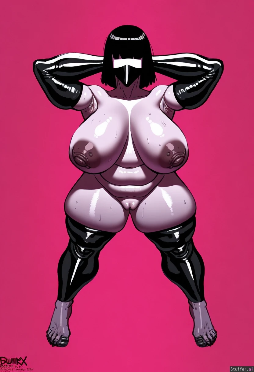 best quality, high rating, White Angel, detailed fellatrix drawing cartoon sketch style, side view, side breast front view, wide stance, face mask, tall mommy, hairless armpits, hairless pussy, perfect woman, blunt black bangs over eyes straight short hair, fat hourglass milf, plump, plump pussy, plump face, chubby arms, hands behind head, big breasts, big puffy nipples, bumpy areola, dark nipples, wide hips, thick legs, venus body, completely naked, high arched wide feet, thick meaty soles bbw feet, thick curvy feet, barefoot, neon pink background, full body view,