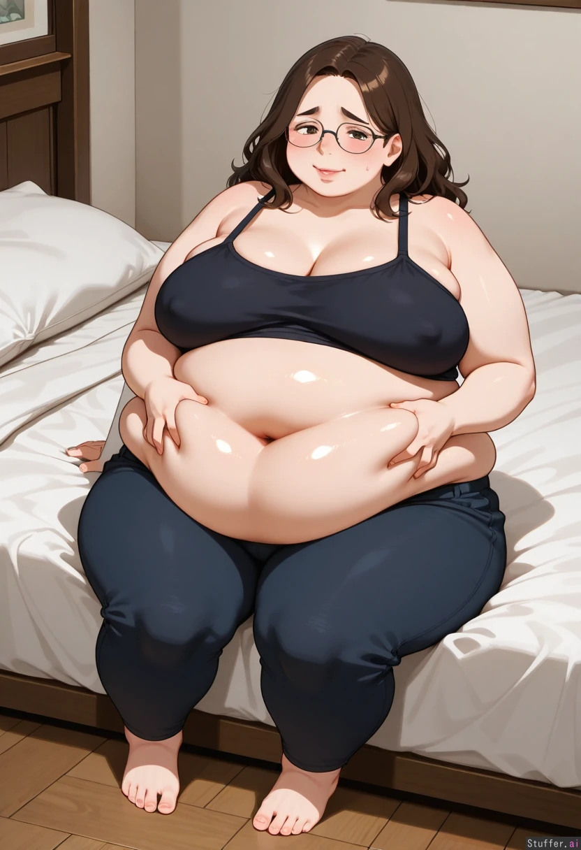 Extremely fat shy girl, masturbating under her huge fat belly rolls, bed, sitting, lazy, thumb in navel