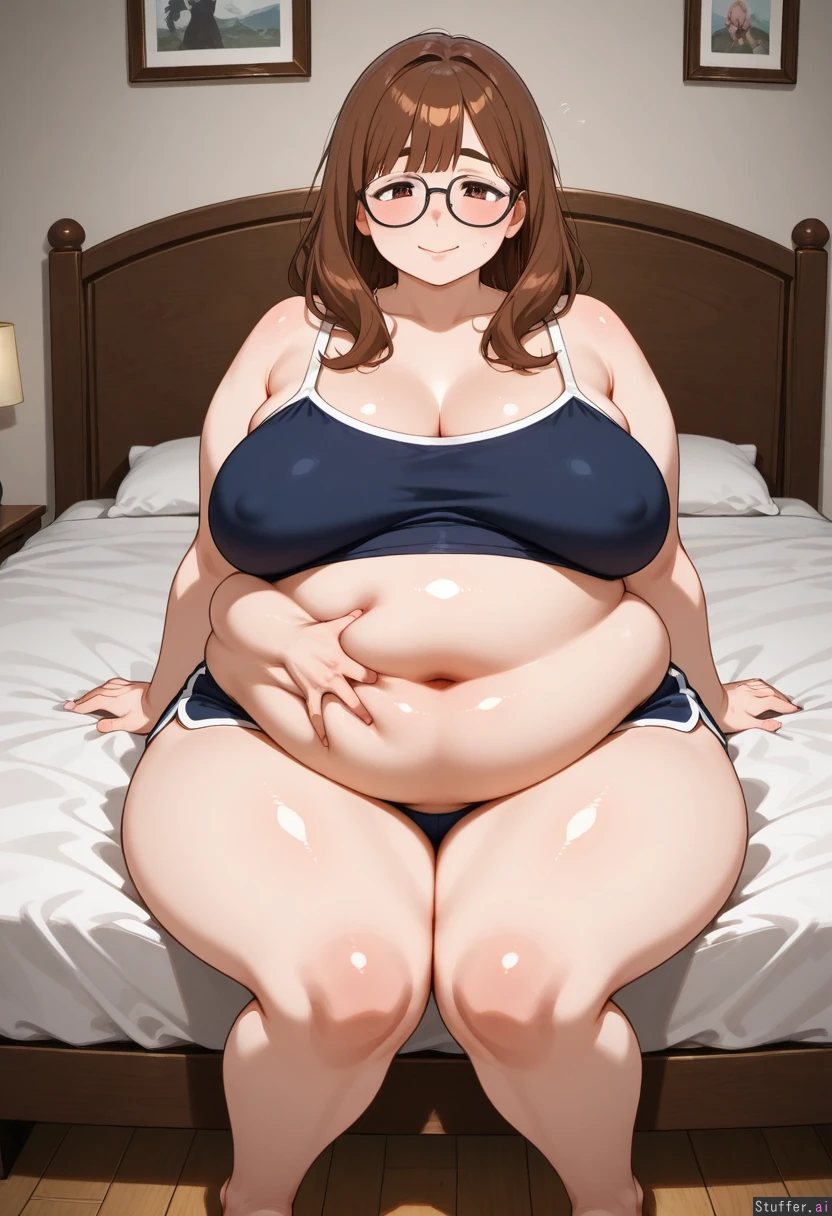 Extremely fat shy girl, masturbating under her huge fat belly rolls, bed, sitting, lazy, thumb in navel, grabbing fat