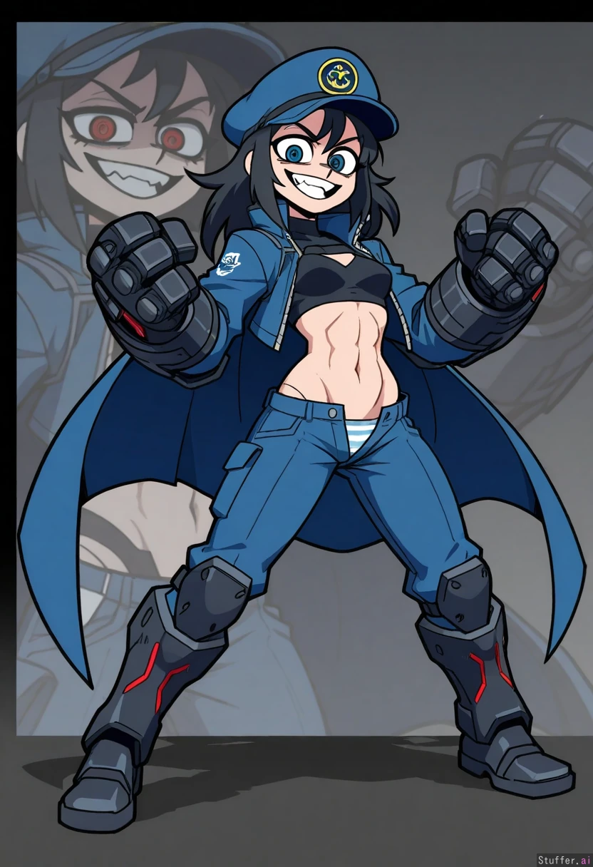 vanripper, sci-fi, cyberpunk, character concept, middle aged woman, villain, crazy, mad smile, large red eyes, heavy armored cyberpunk suit, huge gauntlets, tall and strong, long unkempt hair, cape, midriff, toned body, abs, brawler, dynamic pose, full body, rocket boots, (blue eyes:1.3), black hair, white and blue suit, small breasts under armor, cap, unzipped pants, stripped panties