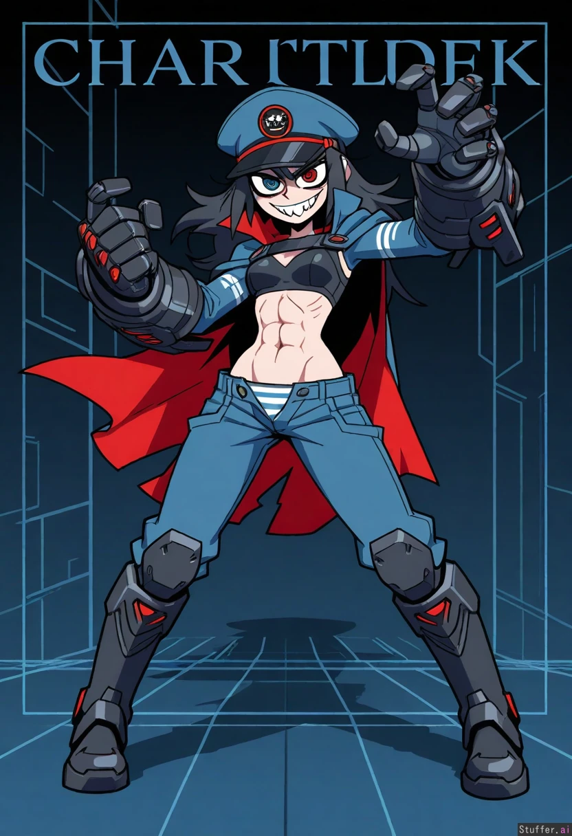 vanripper, sci-fi, cyberpunk, character concept, middle aged woman, villain, crazy, mad smile, large red eyes, heavy armored cyberpunk suit, huge gauntlets, tall and strong, long unkempt hair, cape, midriff, toned body, abs, brawler, dynamic pose, full body, rocket boots, (blue eyes:1.3), black hair, white and blue suit, small breasts under armor, cap, unzipped pants, stripped panties, red and blue lights
