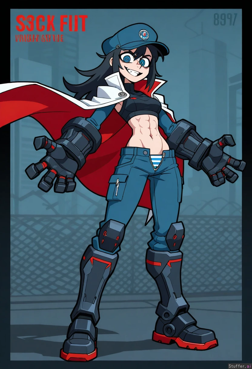 vanripper, sci-fi, cyberpunk, character concept, middle aged woman, villain, crazy, mad smile, large red eyes, heavy armored cyberpunk suit, huge gauntlets, tall and strong, long unkempt hair, cape, midriff, toned body, abs, brawler, dynamic pose, full body, rocket boots, (blue eyes:1.3), black hair, white and blue suit, small breasts under armor, cap, unzipped pants, stripped panties, red and blue lights