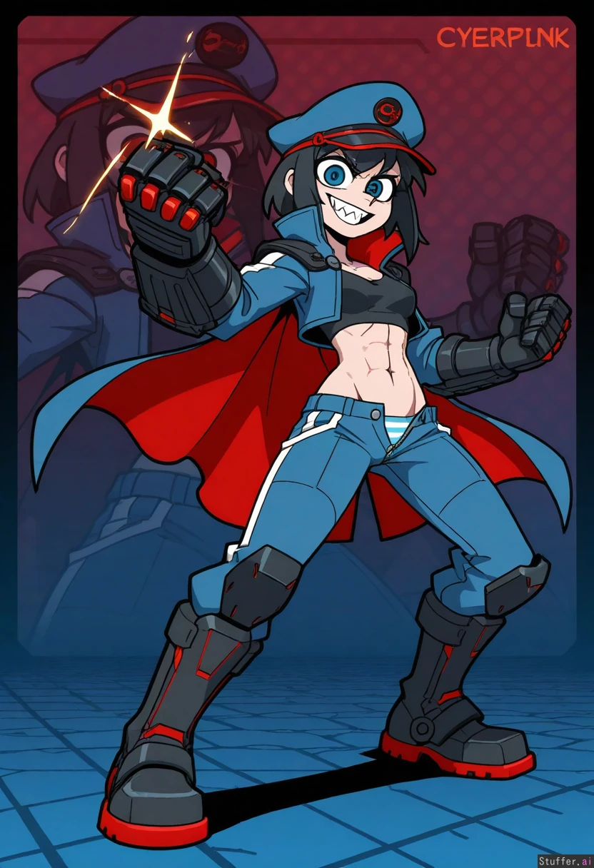 vanripper, sci-fi, cyberpunk, character concept, middle aged woman, villain, crazy, mad smile, large red eyes, heavy armored cyberpunk suit, huge gauntlets, tall and strong, long unkempt hair, cape, midriff, toned body, abs, brawler, dynamic pose, full body, rocket boots, (blue eyes:1.3), black hair, white and blue suit, small breasts under armor, cap, unzipped pants, stripped panties, red and blue lights