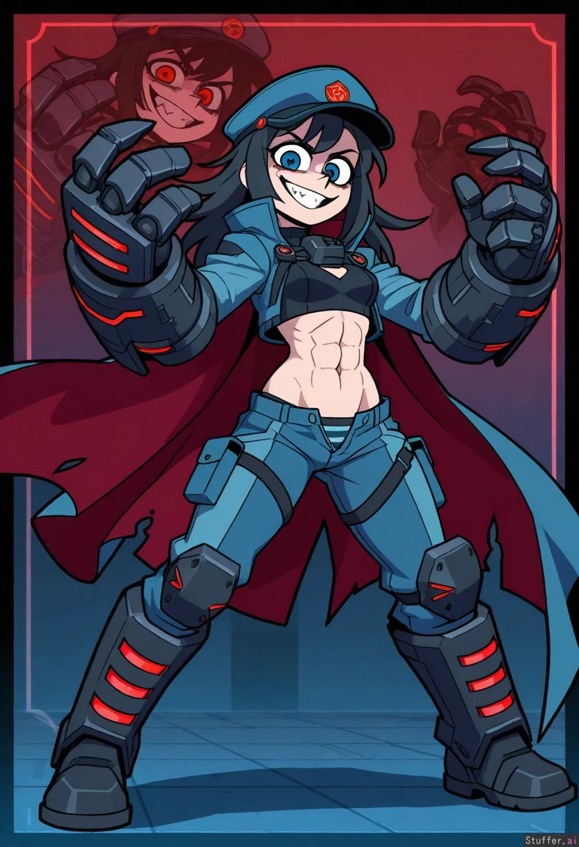 vanripper, sci-fi, cyberpunk, character concept, middle aged woman, villain, crazy, mad smile, large red eyes, heavy armored cyberpunk suit, huge gauntlets, tall and strong, long unkempt hair, cape, midriff, toned body, abs, brawler, dynamic pose, full body, rocket boots, (blue eyes:1.3), black hair, white and blue suit, small breasts under armor, cap, unzipped pants, stripped panties, red and blue lights