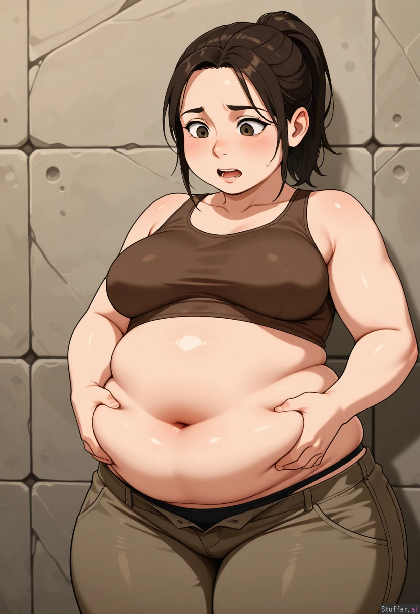 Solo, Highres, pic from front, at a dungeo Lara Croft(Tomb Raider), dark brown hair, ponytail, brown crop top, black panties, anfry and worried expression, looking down, mouth open (wide hips:1.2), (chubby:1.5), (chubby belly:1.6) medium breasts, Putting on brown pants, (Pants squeezing_belly:1.4), (pants stuck halfway up her belly)