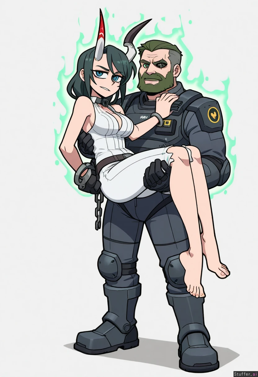 Vanripper, mature man, mature woman, cyberpunk, sci-fi, beatiful, armored business suit, micro tie, collar, handcuffs, villain, (emit green magical aura:1.4), character concept, full body, spiteful, cold greenish blue eyes, simple white background, chain wrapped, torn clothes, one broken horn, (one demonic eye), (strong and buff), (two characters:1.5), (couple:1.5), (male+female:1.3), (carrying person:1.5), white and silver clothes, barefoot, extremly tight clothes