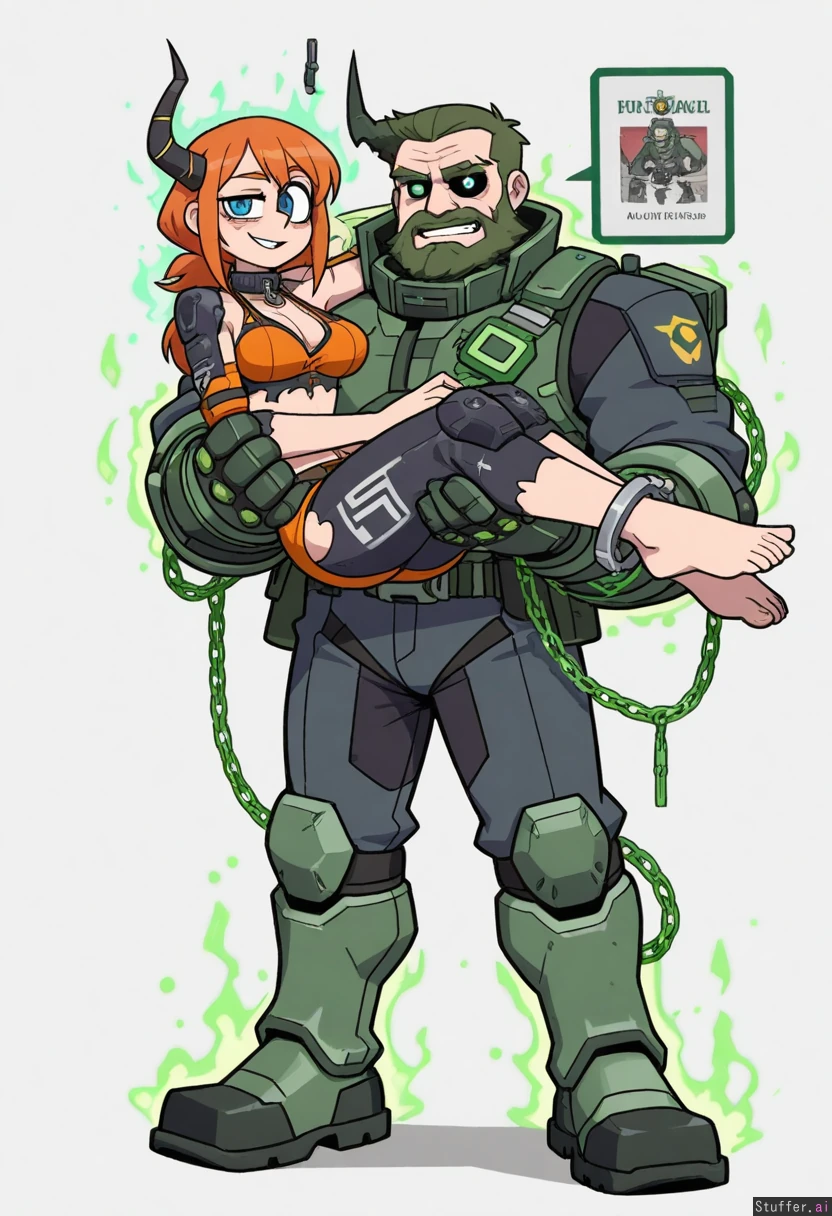 Vanripper, mature man, mature woman, cyberpunk, sci-fi, beatiful, armored business suit, micro tie, collar, handcuffs, villain, (emit green magical aura:1.4), character concept, full body, spiteful, cold greenish blue eyes, simple white background, chain wrapped, torn clothes, one broken horn, (one demonic eye), (strong and buff), (two characters:1.5), (couple:1.5), (male+female:1.3), (carrying person:1.5), bright orange clothes, barefoot, prinsoner suit