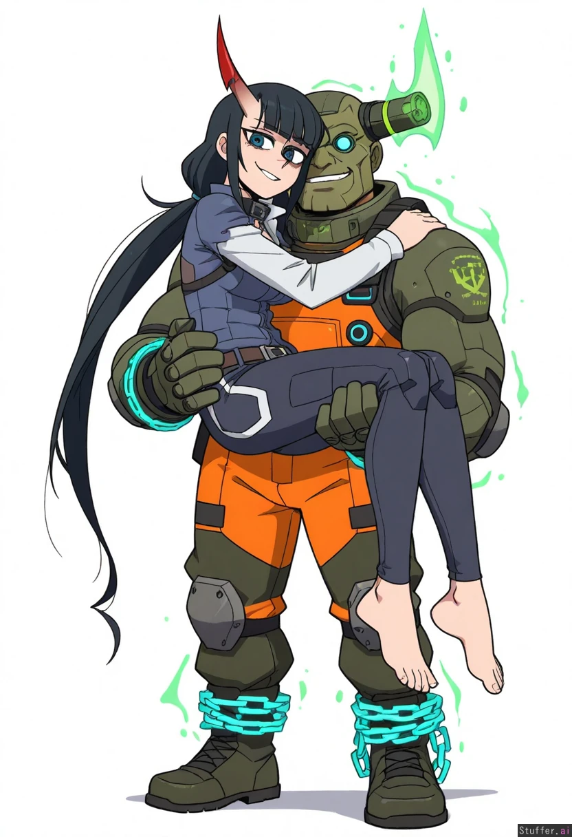 Vanripper, mature man, mature woman, cyberpunk, sci-fi, beatiful, armored business suit, micro tie, collar, handcuffs, villain, (emit green magical aura:1.4), character concept, full body, spiteful, cold greenish blue eyes, simple white background, chain wrapped, torn clothes, one broken horn, (one demonic eye), (strong and buff), (two characters:1.5), (couple:1.5), (male+female:1.3), (carrying person:1.5), bright orange clothes, barefoot, prinsoner suit