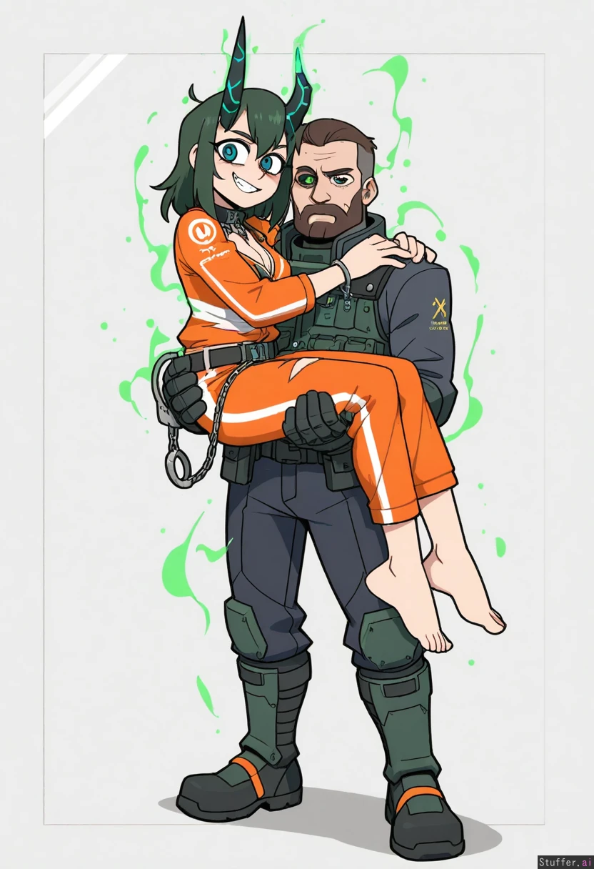 Vanripper, mature man, mature woman, cyberpunk, sci-fi, beatiful, armored business suit, micro tie, collar, handcuffs, villain, (emit green magical aura:1.4), character concept, full body, spiteful, cold greenish blue eyes, simple white background, chain wrapped, torn clothes, one broken horn, (one demonic eye), (strong and buff), (two characters:1.5), (couple:1.5), (male+female:1.3), (carrying person:1.5), bright orange clothes, barefoot, prinsoner suit