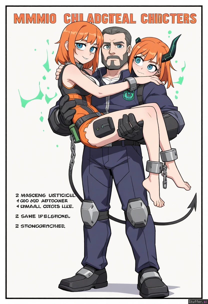 Vanripper, mature man, mature woman, cyberpunk, sci-fi, beatiful, armored business suit, micro tie, collar, handcuffs, villain, (emit green magical aura:1.4), character concept, full body, spiteful, cold greenish blue eyes, simple white background, chain wrapped, torn clothes, one broken horn, demon, (strong and buff), (two characters:1.5), (couple:1.5), (male+female:1.3), (carrying person:1.5), bright orange clothes, barefoot, prinsoner suit