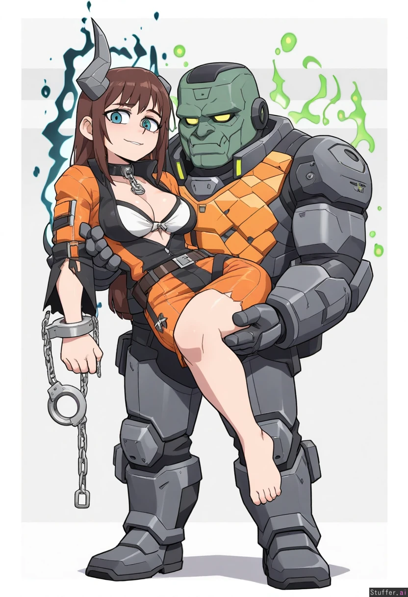 Vanripper, mature man, mature woman, cyberpunk, sci-fi, beatiful, armored business suit, micro tie, collar, handcuffs, villain, (emit green magical aura:1.4), character concept, full body, spiteful, cold greenish blue eyes, simple white background, chain wrapped, torn clothes, one broken horn, demon, (strong and buff), (two characters:1.5), (couple:1.5), (male+female:1.3), (carrying person:1.5), bright orange clothes, barefoot, prinsoner suit