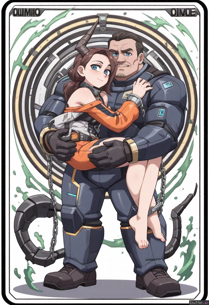 Vanripper, mature man, mature woman, cyberpunk, sci-fi, beatiful, armored business suit, micro tie, collar, handcuffs, villain, (emit green magical aura:1.4), character concept, full body, spiteful, cold greenish blue eyes, simple white background, chain wrapped, torn clothes, one broken horn, (strong and buff), (two characters:1.5), (couple:1.5), (male+female:1.3), (carrying person:1.5), bright orange clothes, barefoot, prinsoner suit