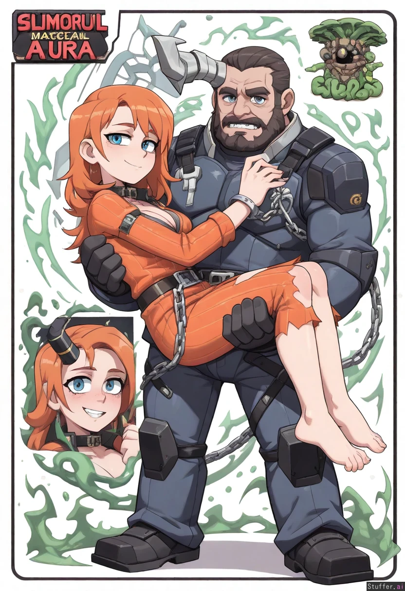 Vanripper, mature man, mature woman, cyberpunk, sci-fi, beatiful, armored business suit, micro tie, collar, handcuffs, villain, (emit green magical aura:1.4), character concept, full body, spiteful, cold greenish blue eyes, simple white background, chain wrapped, torn clothes, one broken horn, (strong and buff), (two characters:1.5), (couple:1.5), (male+female:1.3), (carrying person:1.5), bright orange clothes, barefoot, prinsoner suit