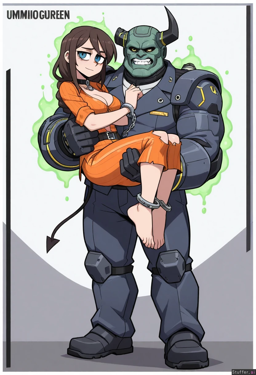 Vanripper, mature man, mature woman, cyberpunk, sci-fi, beatiful, armored business suit, micro tie, collar, handcuffs, villain, (emit green magical aura:1.4), character concept, full body, spiteful, cold greenish blue eyes, simple white background, chain wrapped, torn clothes, one broken horn, (strong and buff), (two characters:1.3), (couple:1.3), (male+female:1.3), (carrying person:1.3), bright orange clothes, barefoot, prinsoner suit