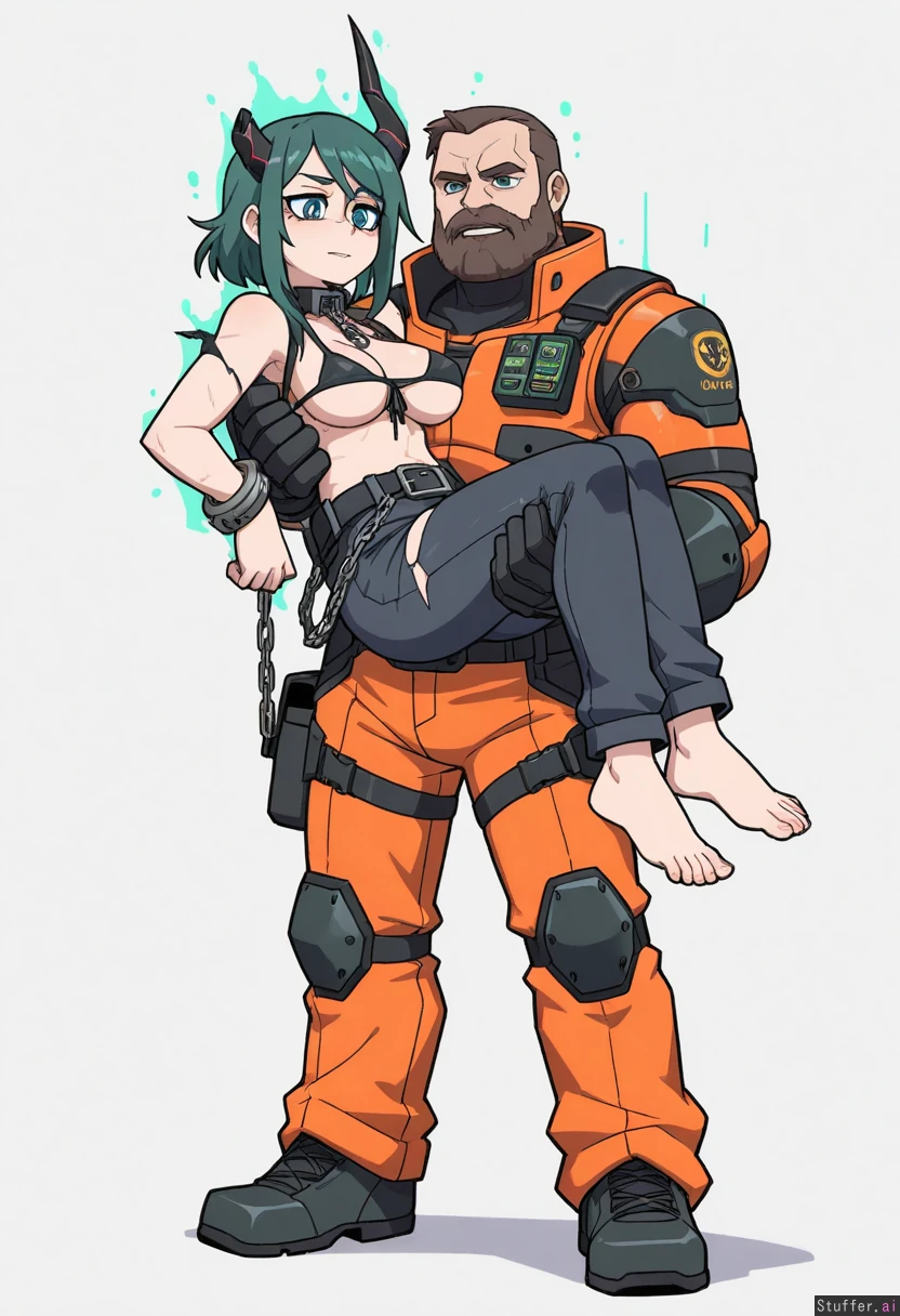 Vanripper, mature man, mature woman, cyberpunk, sci-fi, beatiful, armored business suit, micro tie, collar, handcuffs, villain, (emit green magical aura:1.4), character concept, full body, spiteful, cold greenish blue eyes, simple white background, chain wrapped, torn clothes, one broken horn, (strong and buff), (two characters:1.3), (couple:1.3), (male+female:1.3), (carrying person:1.3), bright orange clothes, barefoot, prinsoner suit, bare_breasts:1.2