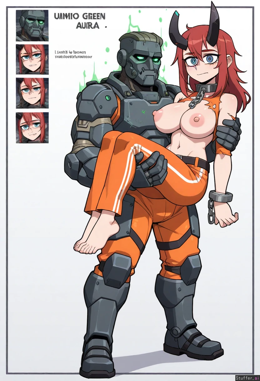 Vanripper, mature man, mature woman, cyberpunk, sci-fi, beatiful, armored business suit, micro tie, collar, handcuffs, villain, (emit green magical aura:1.4), character concept, full body, spiteful, cold greenish blue eyes, simple white background, chain wrapped, torn clothes, one broken horn, (strong and buff), (two characters:1.3), (couple:1.3), (male+female:1.3), (carrying person:1.3), bright orange clothes, barefoot, prinsoner suit, bare_breasts:1.2, sharp small nipples