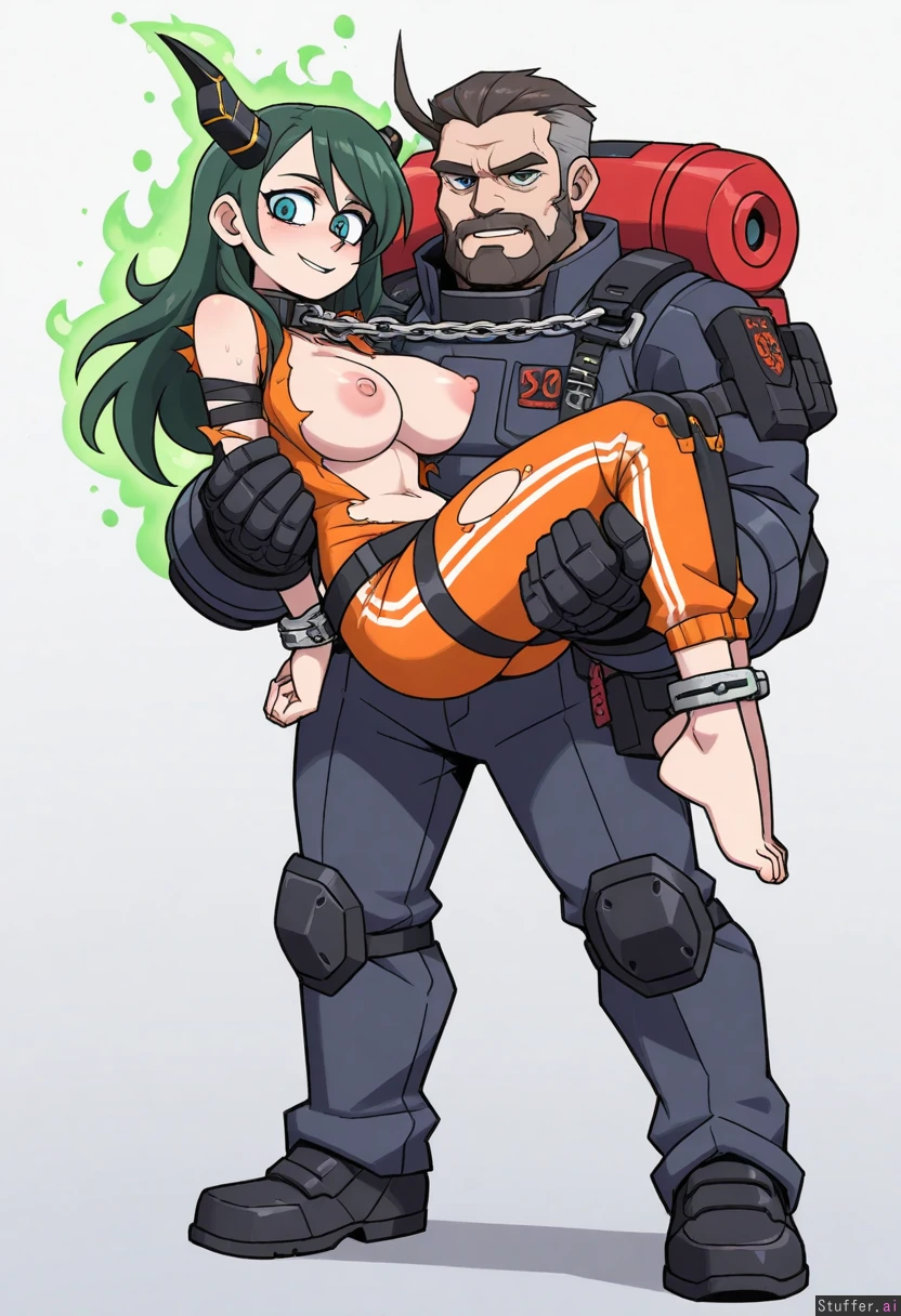 Vanripper, mature man, mature woman, cyberpunk, sci-fi, beatiful, armored business suit, micro tie, collar, handcuffs, villain, (emit green magical aura:1.4), character concept, full body, spiteful, cold greenish blue eyes, simple white background, chain wrapped, torn clothes, one broken horn, (strong and buff), (two characters:1.3), (couple:1.3), (male+female:1.3), (carrying person:1.3), bright orange clothes, barefoot, prinsoner suit, bare_breasts:1.2, sharp small nipples