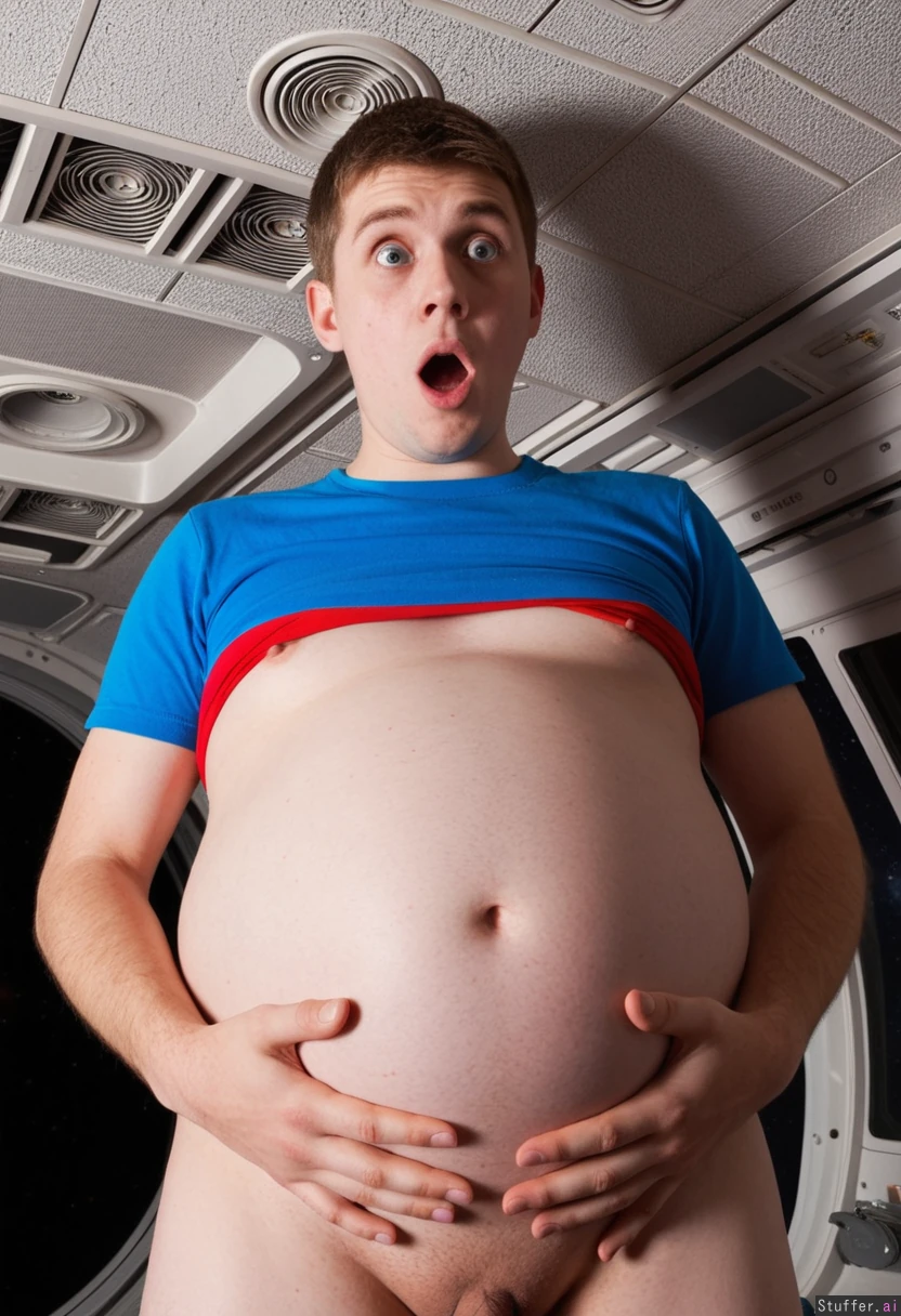 Pregnant young man. Round belly. Shocked.on a spaceship.