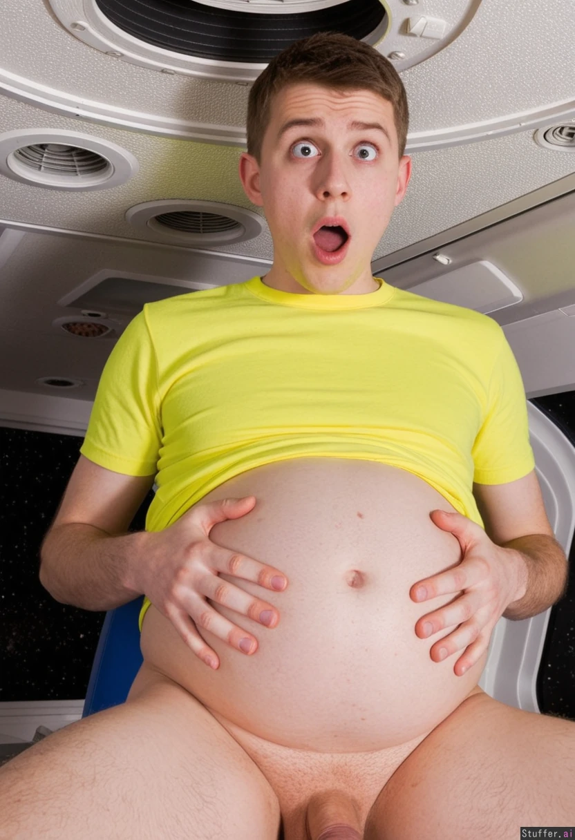 Pregnant young man. Round belly. Shocked.on a spaceship.