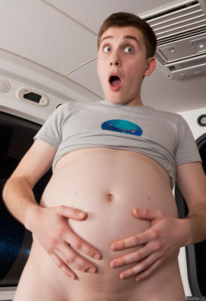 Pregnant young man. Round belly. Shocked.on a spaceship.