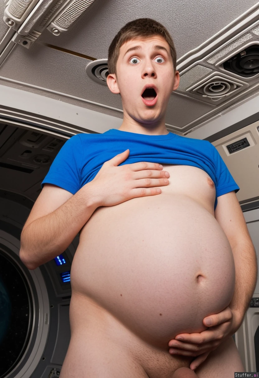 Pregnant young man. Round belly. Shocked.on a spaceship.