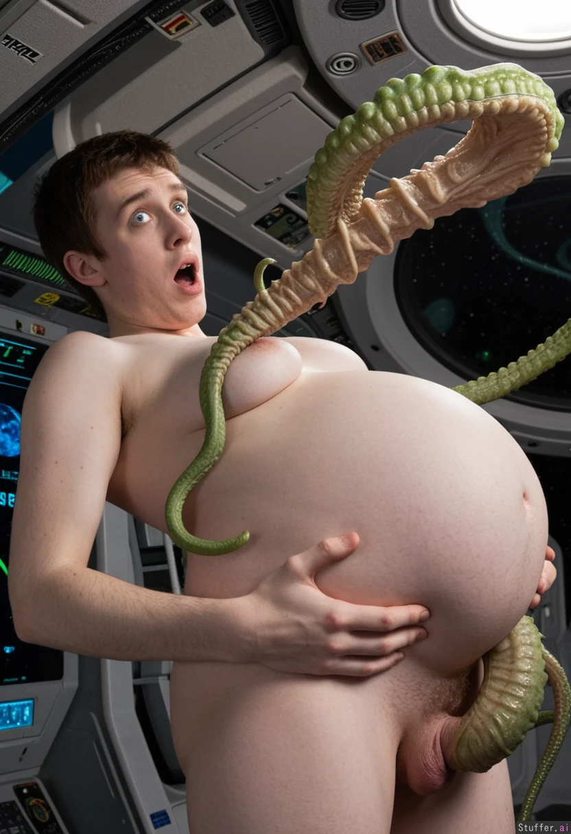 Pregnant young man. Round belly. Shocked.on a spaceship. Alien tentacles in his butt.