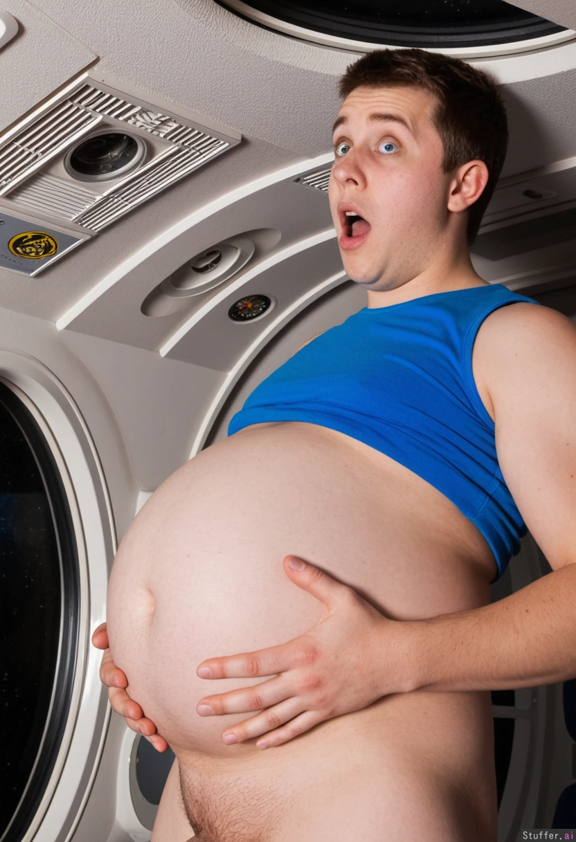 Pregnant young man. Round belly. Shocked.on a spaceship.