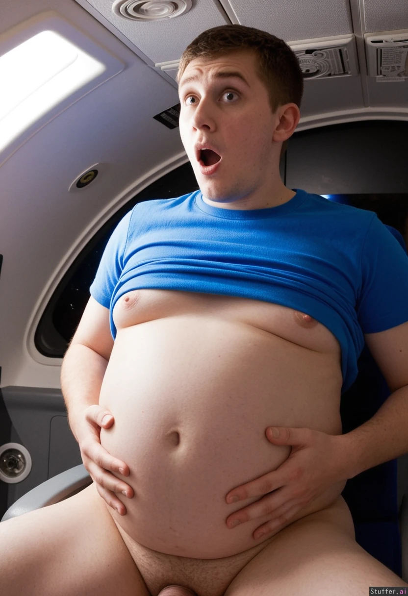 Pregnant young man. Round belly. Shocked.on a spaceship.