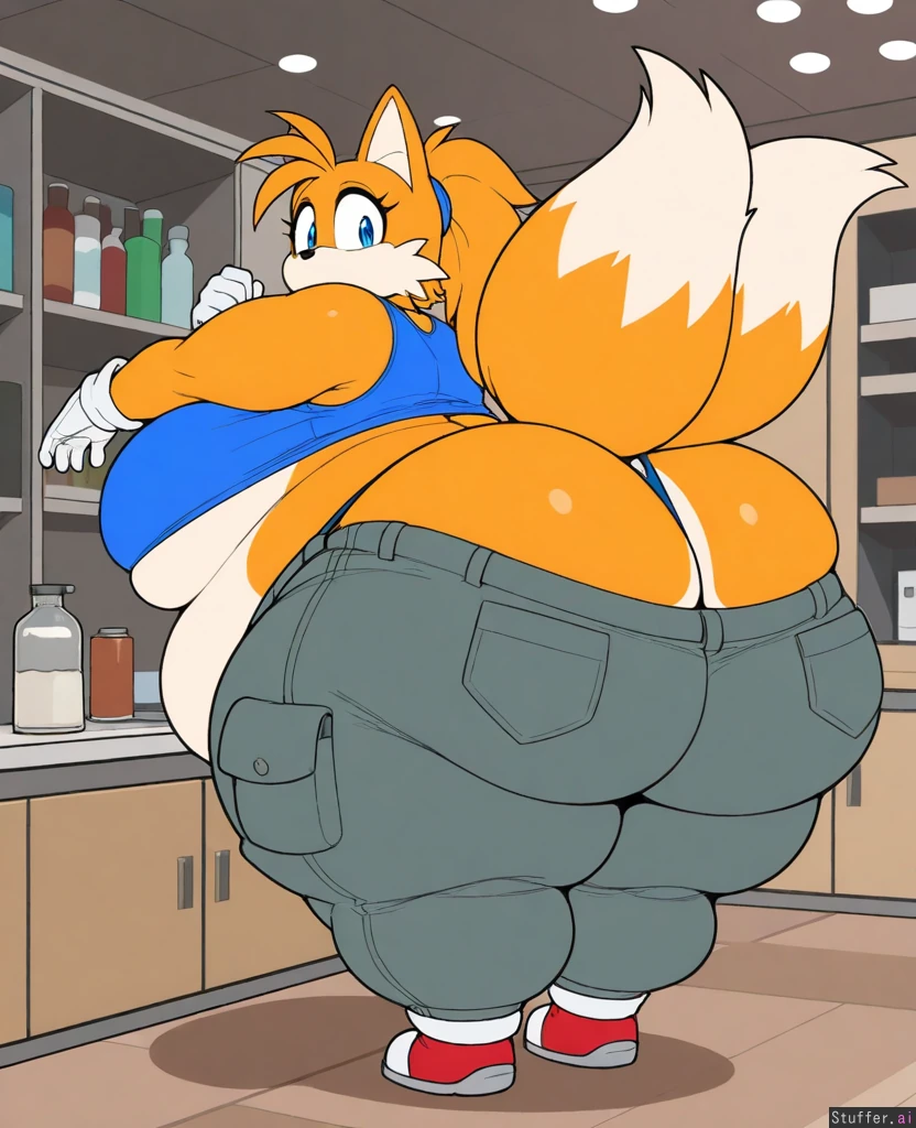 Krekkov artist, solo, 1girl, (Flat color, anthro tails the fox girl from sonic, side_view), female, woman 20 years, ponytail, big fluffy fat tails, body_expansion make her obese Dark blue work shirt, grey cargo pants, (huge thick thighs, huge ass, fat legs, obese legs, hyper fat thighs, obese ass, wide hips, fat folds, chubby:1.4), (big boobs, sideboob, underboob, hanging breasts), hyper ass hyper body fat Fat torso, even fatter torso, even fatter stomach make her even fatter, flabby belly Make her have too much body fat ((Wardrobe Malfunction)),can't pull up pants,(((overflowing fat ass too big for cargo pants, sagging cargo pants,stretching thong))) ((Laboratory background)) ,((Indoors)),((Aroused, surprised)), ((Struggling)), ((Looking back at own ass)), skin dentation, stretched fabric, flabby fat folds on belly, stomach , legs, weight_gAin ((Anthro fox, orange fur,Sonic the hedgehog walks in and sees her) )), (female tails the fox from sonic), sonic shoes, white gloves,(alone), solo anthro girl, furry, fox with two tails, tails_(sonic), fox_nose