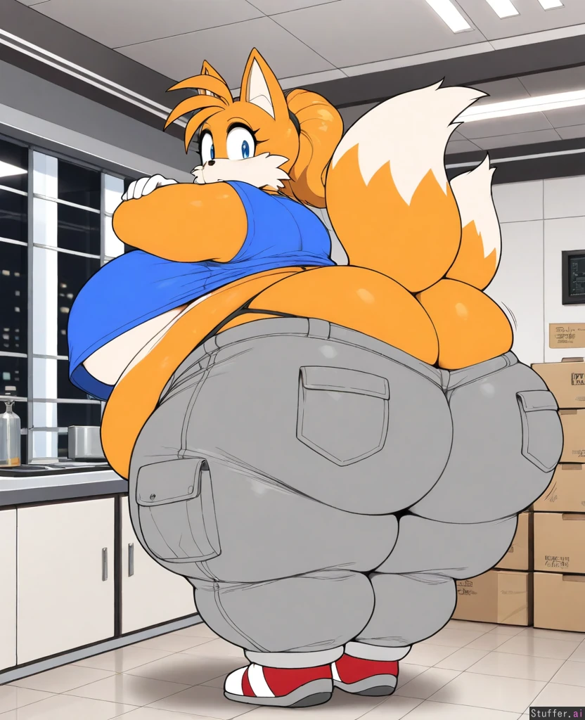 Krekkov artist, solo, 1girl, (Flat color, anthro tails the fox girl from sonic, side_view), female, woman 20 years, ponytail, big fluffy fat tails, body_expansion make her obese (((Dark blue) work shirt with pocket, heavy grey cargo pants)), (huge thick thighs, huge ass, fat legs, obese legs, hyper fat thighs, obese ass, wide hips, fat folds, chubby:1.5), (big boobs, sideboob, underboob, hanging breasts), hyper ass hyper body fat Fat torso, even fatter torso, even fatter stomach make her even fatter, flabby belly Make her have too much body fat ((Wardrobe Malfunction)),can't pull up pants,(((overflowing fat ass too big for cargo pants, sagging heavy cargo pants with many pockets,stretching thong))) ((Laboratory background)) ,((Indoors)),((Aroused, surprised)), ((Struggling)), ((Looking back at own ass)), skin dentation, stretched fabric, flabby fat folds on belly, stomach , legs, weight_gAin ((Anthro fox, orange fur,Sonic the hedgehog walks in and sees her) )), (female tails the fox from sonic), sonic shoes, white gloves,(alone), solo anthro girl, furry, fox with two tails, tails_(sonic), fox_nose