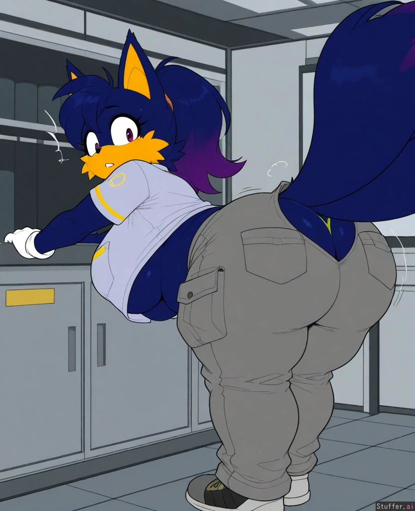 Krekkov artist, solo, 1girl, ((Flat color), anthro tails the fox girl from sonic, side_view), female, woman 20 years, ponytail, big fluffy fat tails, body_expansion make her obese ((Tight (Dark blue) work shirt with pocket, heavy grey cargo pant:1.7))), (huge thick thighs, huge ass, fat legs, obese legs, hyper fat thighs, obese ass, wide hips, fat folds, chubby:1.5), (big boobs, sideboob, underboob, hanging breasts), hyper ass hyper body fat Fat torso, even fatter torso, even fatter stomach make her even fatter, flabby belly Make her have too much body fat ((Wardrobe Malfunction)),can't pull up pants,(((overflowing fat ass too big for cargo pants, sagging heavy cargo pants with many pockets,stretching thong))) ((Laboratory background)) ,((Indoors)),((Aroused, surprised)), ((Struggling)), ((Looking back at own ass)), skin dentation, stretched fabric, (flabby fat folds on belly, thighs, legs), weight_gAin ((Anthro fox, orange fur,Sonic the hedgehog walks in and sees her) )), (female tails the fox from sonic), sonic shoes, white gloves,(alone), solo anthro girl, furry, fox with two tails, tails_(sonic), fox_nose