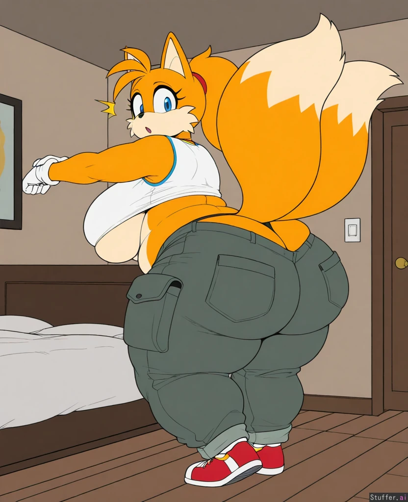 Krekkov artist, solo, 1girl, ((Flat color), anthro tails the fox girl from sonic, side_view), female, woman 20 years, ponytail, big fluffy fat tails, body_expansion ((work shirt with pocket, tight grey cargo pants))), (huge thick thighs, huge ass, fat legs, obese legs, hyper fat thighs, obese ass, wide hips, fat folds:1.7), (big boobs, sideboob, underboob, large hanging breasts), hyper ass, voluptuous, very thick overinflated thighs (Hyper wide hips, massive fat legs,hyper massive fat thighs, hyper gigantic fat ass:1.3), thicc, wide hips,curvaceous (flabby breasts, leg expansion,thighs expansion, and hips expansion:1.7) ((Wardrobe Malfunction)),can't pull up pants,(((overflowing fat ass too big for cargo pants, sagging heavy cargo pants with many pockets,stretching thong))) ((Bedroom background)) ,((Indoors)),((Aroused, surprised)), ((Struggling)), ((Looking back at own ass)), skin dentation, stretched fabric, (flabby fat folds on thighs, legs), weight_gAin ((Anthro fox, orange fur,Sonic the hedgehog walks in and sees her) )), (female tails the fox from sonic), sonic shoes, white gloves,(alone), solo anthro girl, furry, fox with two tails, tails_(sonic), fox_nose, stretching, cute pose