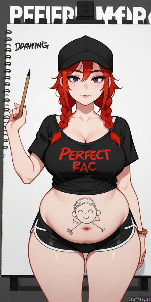 mdf_an, blushyspice, ((((face)))), (((perfect detail))), softservice, c.cu, spellsx, Colored, colorization, perfect anatomy, perfect perspective, perfect artstyle, absurd res, high res, detailed, ultra quality, ((high quality)), masterpiece, (ultra high resolution), anime style, stunning beauty, detailed face, intricate detail, sophisticated detail, face, exquisite detail, absurd resolution, correct anatomy, 8k, (highly detailed face), highly detailed skin texture, blushyspicy(artist), spellsX(artist), c.cu(artist), 1girl, animesexy pose, cleavage, deep navel, ((drawing:2.5)),((kipteitei artstyle:1.2)), ((Long red hair)), ((standing)), ((baggy black shirt)), ((gothmetal girl)), ((metal listener)), ((small black jean shorts)), ((piercings, tattoos)), ((two braids)), ((black cap)), ((Wide hips)), ((chubby)), ((curvaceous)), ((small bloated belly)), ((low navel)), ((bellyhang)), ((perky tits)), ((big round belly:1.4)), ((big ass), ((fat hips:2.0)), ((bottomheavy)), ((massive tits:1.5)), ((giant hips)),