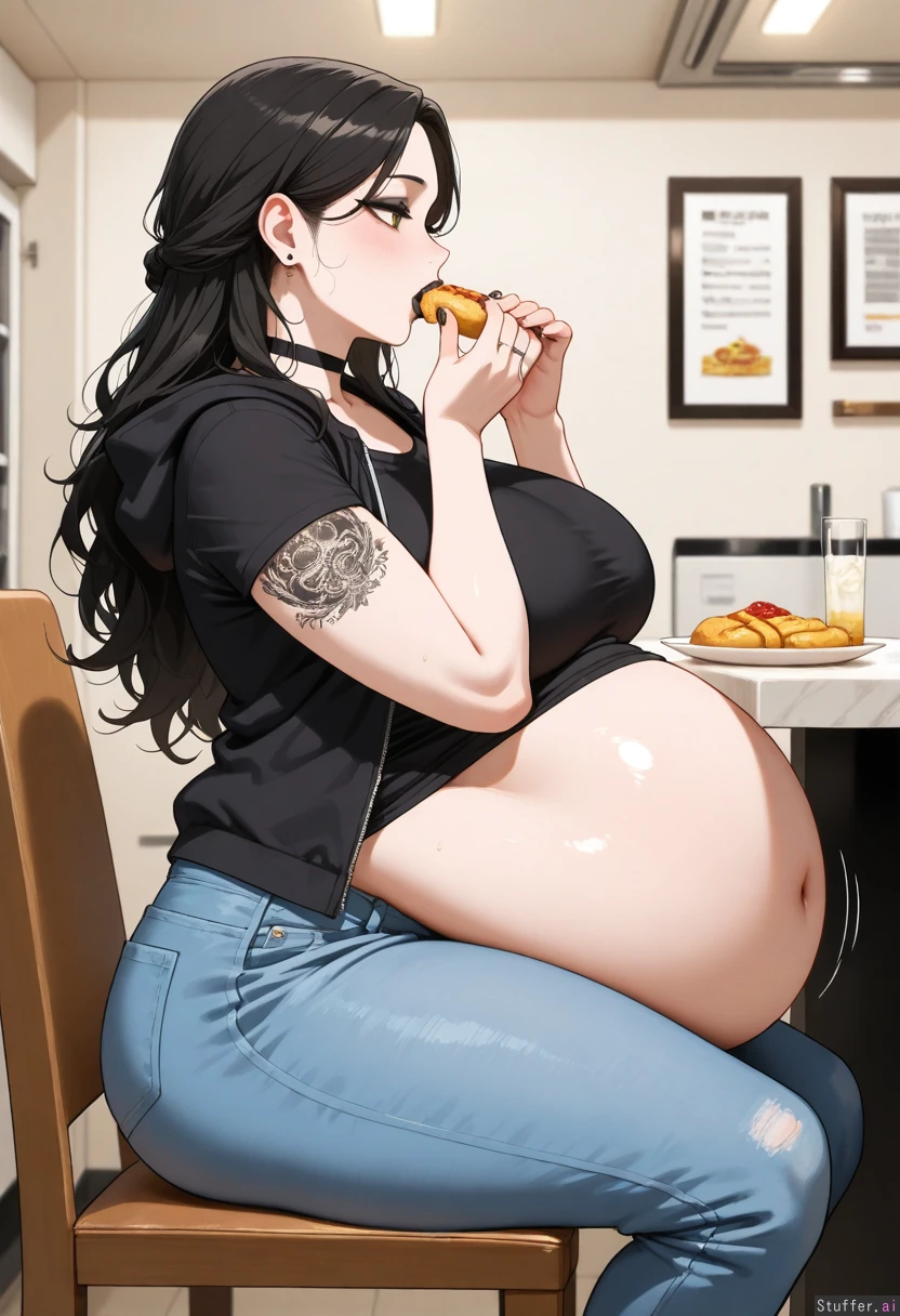 ((best quality, highly detailed, detailed face)) Mature woman, milf, mature face, tall, long messy hair, hair bangs, yellow eyes, black eyeliner, black mascara, black eyeshadow, black lipstick, extra chubby, big belly, t-shirt, jeans, open hoodie, choker, tattoos on lower arm, wedding ring, inside buffet, seductive_look, sitting on chair, eating food , growing belly, (huge bloated round belly), (side view), belly on thighs,, belly hitting table, too full,