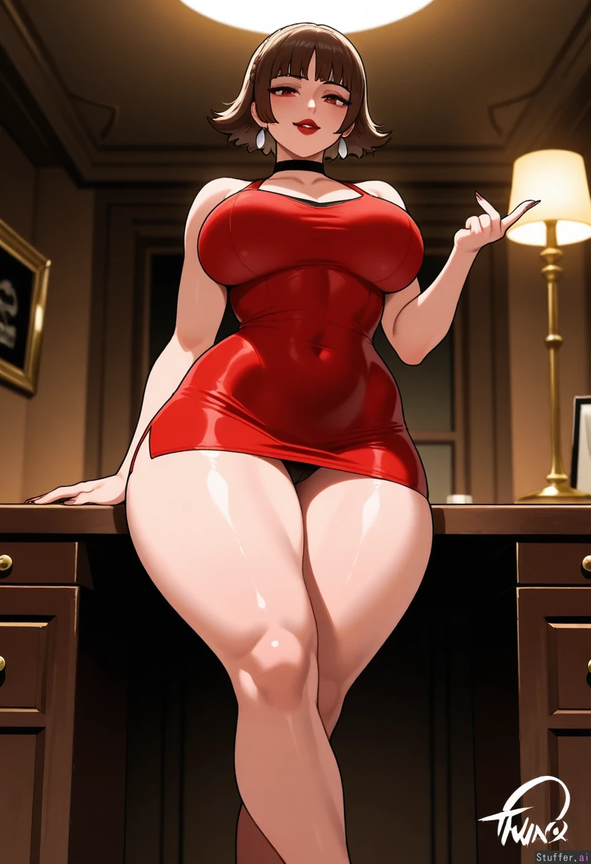 nyantcha makoto_niijima, curvy figure, massive thick thighs, ((, front view)), secretary, white long fingernails, sexy pose, horny, inside rich ceo modern expensive dark private tall office, silver earrings, wearing sexy red short dress , dark brown cabinets in background with one yellow lamp, dark red lipstick Seductive look, thick ass,