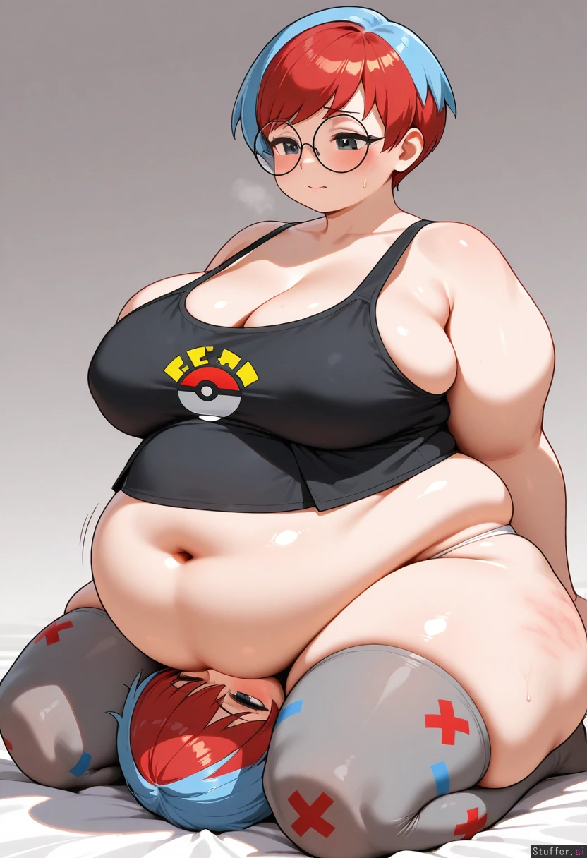 female, (Penny_(pokmon), facesitting, stretchmarks, aroused, skindentation, obese, belly_overhang, big_breasts, tank top, (big belly), soft, ((fat arms))