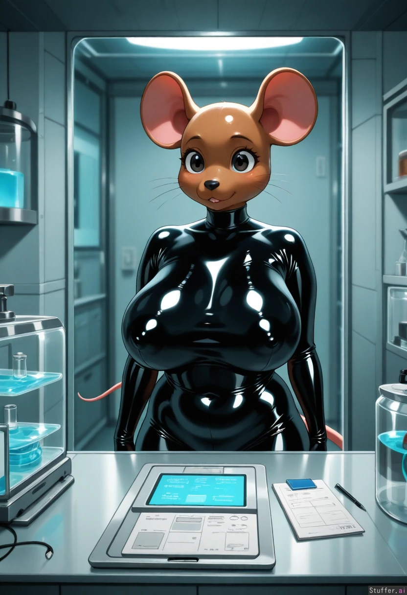 BBW , latex bodysuit , laboratory , mouse head , ,