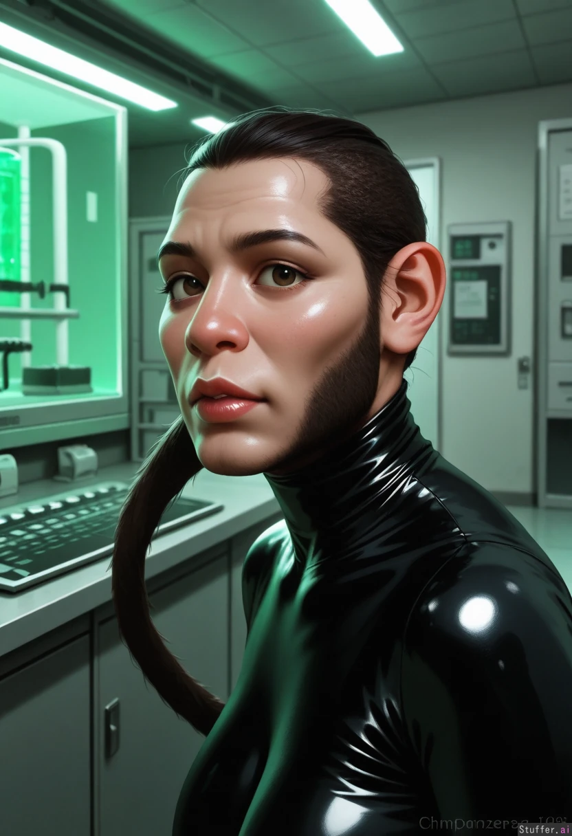 BBW , latex bodysuit , laboratory , chimpanzee head , realistic ,