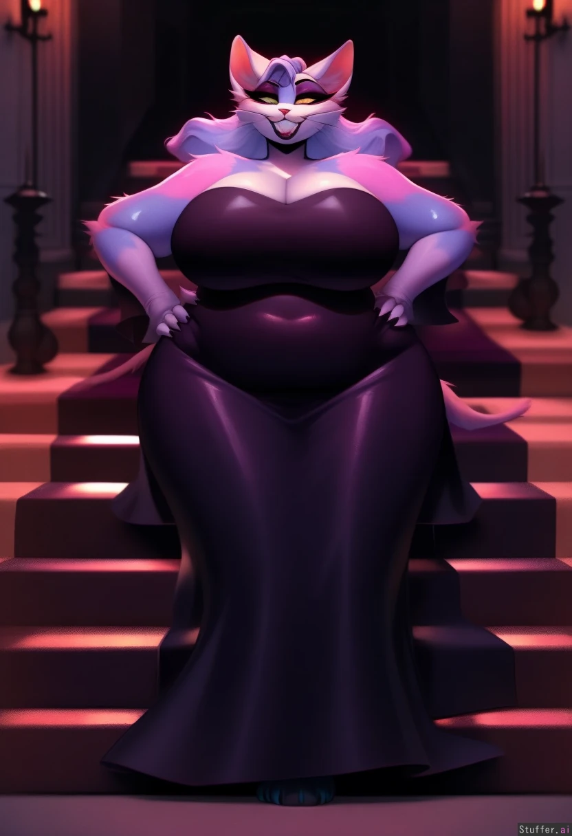 best quality, high rating, chubby, anthropomorphic cat lady, silvery cream fur, tight dark purple dress, flirty smile, top of stairs, in front of grand entrance