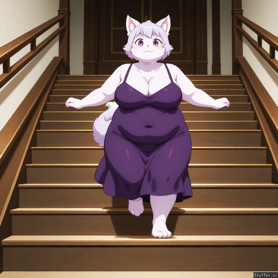 chubby, anthropomorphic cat lady, silvery cream fur, tight dark purple dress, top of stairs, in front of grand entrance