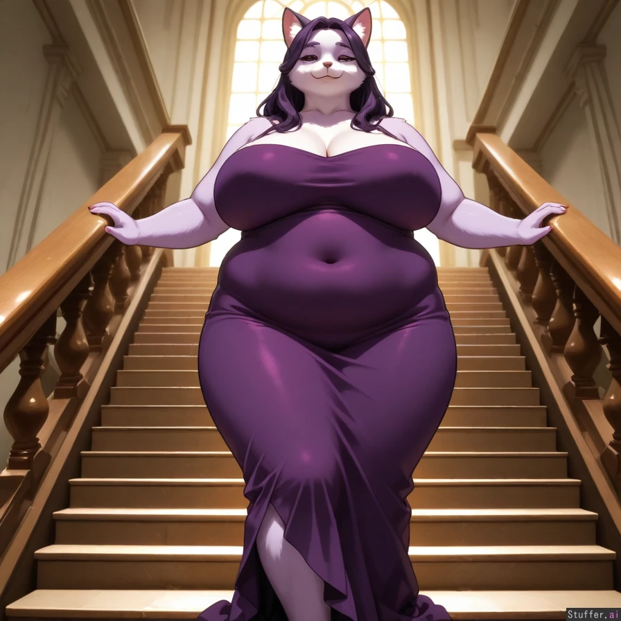 chubby, sexy, mature, anthropomorphic cat lady, silvery cream fur, tight dark purple dress, top of stairs, in front of grand entrance