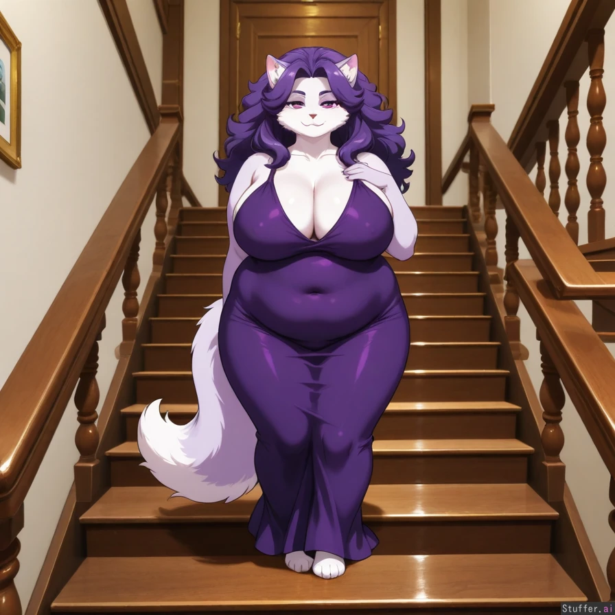 chubby, sexy, mature, anthropomorphic cat lady, silvery cream fur, tight dark purple dress, fluffy hair, top of stairs, in front of grand entrance
