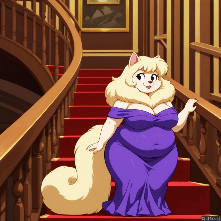 high quality, disney style, chubby, sexy, mature, anthropomorphic cat lady, silvery cream fur, tight dark purple dress, blonde fluffy hair, top of stairs, in front of grand entrance