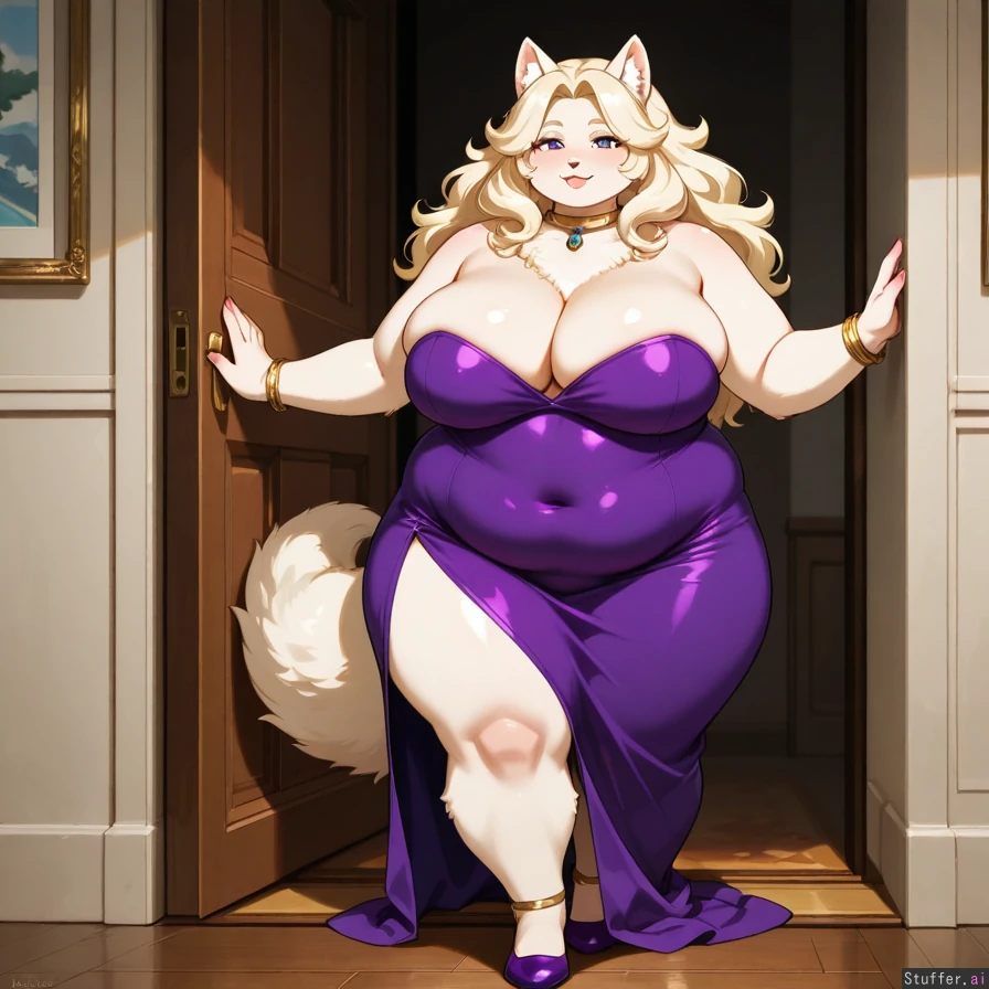 high quality, chubby, sexy, mature, anthropomorphic cat lady, silvery cream fur, tight dark purple dress, jewelry, blonde fluffy hair, in front of grand entrance